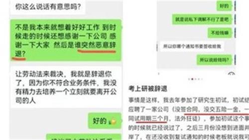 4月26號一名網友稱考研上岸被公司以能力不足辭退,2022年這名浙江麗水的網友研究生找到了一家公司參加應聘,這家公司的老板答應自己的試用期是一共三個月,表現好的話將獲得轉正的機會,隨后這名網友考上了研究生,公司老板卻以能力不足將其辭退。