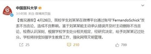 中國醫科大學于27日在社交媒體上也發布了相關情況的通報,表示該校的學生劉某某在微博平臺上于4月26日發布了不正當的言論,在社會上造成了不好的影響。鑒于該名學生能夠主動的將錯誤進行承認,并且將不當的言論進行主動的刪除,目前已經深刻的認識到自己的錯誤,并且做出了相應的檢查,學校根據相關的規定對該生進行處分,采取記過的形式。學校在今后將會持續的將學生們的教育工作進行加強,同時也會不斷的將網絡文明的管理進行不斷的強化。此事在網絡上也引起了很大的反響,有很多網友對這名學生的行為表示了憤怒,認為這樣的學生進行記過處分都太輕了,應當立即開除。