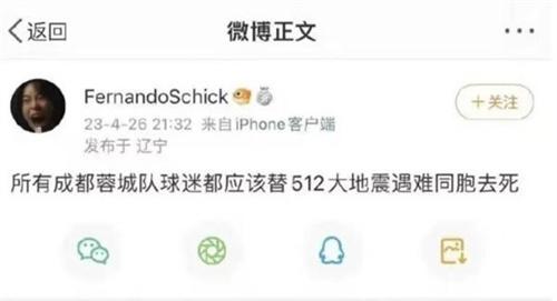 大連和成都的球迷在中超聯賽,成都蓉城與大連人的比賽之后,陷入場外糾紛。有一部分大連的球迷對成都蓉城爆粗口。網絡上另外還傳出了成都球迷在場外遭到了一部分大連球迷的圍追堵截。一名網名ID為fernandoschick的網友,于4月26日晚上9:30左右發布微博聲稱成都蓉城的球迷都應該去死代替512大地震中遇難的同胞們。該網友在當晚的10點23分發布微博表示道歉,表示512大地震是全國人民的痛,不應該進行隨意的調侃,對此表示道歉。