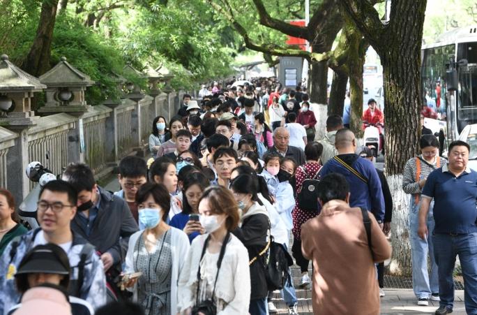 長沙橘子洲景區截止到4月29日的下午16點,所接待的游客量就已經達到了6.8萬。岳麓山景區所接待的游客量達到了6.1萬。岳麓山和橘子洲這兩個景區從4月30號到5月2號的門票早就已經預約一空。人多的地方不僅僅是長沙的各個景區景點,還有長沙的步行街和五一商圈。五一商圈截止到4月29號,下午17:00的累計客流量就已經達到了45.53萬,實時的人數是197,103,其中有65%是外地的。五一商圈附近的各個飯店也都開啟了排隊的模式。有游客稱自己到笨蘿卜排號是上午9:00,前面在等位的就已經有了100多桌,甚至有人早上8:00就過來拿號,隔壁桌有的姐姐在等飯的時候甚至在補覺。超級文和友早上10:00還沒到飯點的時候也排起了長長的隊伍,隊伍的長度達到了數百米。下午5點左右的時候所排的號碼已經達到了4位數,前面在等待用餐的有300多桌