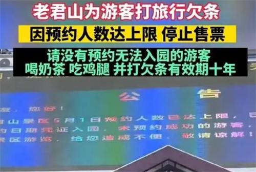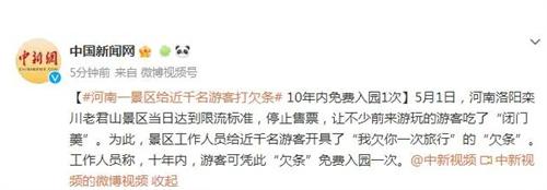 北京時間5月1號洛陽欒川縣老君山景區因為游客承載量已經達到了極限。導致許多沒有提前預約來旅游的游客遭到了限流,沒有能夠成功進入景區,為了進一步安撫游客的情緒景區的工作人員也在景區門口為上千名游客都送上了簡單的午餐以及奶茶,還向沒有能夠成功進入景區的游客打下了這樣一張欠條,欠條上寫上我欠您一次旅行,憑借此欠條可以免費入園旅游一次有效期10年。