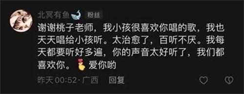 走紅之后的桃子老師也發表了自己對這首歌走紅的另一種看法,在自己的社交賬號上公布這首挖呀挖呀的視頻時,其實就是為了記錄生活日常,自己平時也就只有100多個粉絲,自從這首歌發布之后,迎來了不小的反響,獲得了很多人的關注。憑借一首歌走紅,也是自己意想不到的事。正是因為走紅,讓自己也受到了一些意想不到的影響。有的人喜歡桃子老師,有的人不喜歡桃子老師,喜歡與不喜歡之間的轉換會影響到桃子老師的心情。目前桃子老師只想專注于本職工作,還是繼續做一個快樂的普通人。一首簡單的童謠能夠治愈成年人,也同樣是對快樂的憧憬。