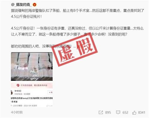 網傳在緬甸游船中發現了4.5公斤的身份證件,有千人在此受到了器官移植,經過證實是假的。網絡流傳一說法“緬甸海岸警衛隊在非法游船當中發現了4.5公斤的身份證件”,這一說法是缺乏實證的,相關圖片在2015年1月份出現,當時反映的是鄭州失物招領公司積壓了將近數萬張身份證件無人認領。緬甸國防部網站和國家門戶網站以及國防部總司令網站,近日都未發表過與海岸警衛隊查獲非法流傳的任何信息。