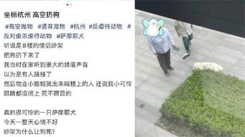 據了解這起這一事件,主要發生在杭州市的移動居民住樓內,網友向媒體進行爆料稱,在這棟樓8樓有一對情侶發生了吵架的事件,當時這一對情侶由于一些瑣碎的事情引發了爭執,憤怒的情緒驅使之下,一方直接將一只狗從8樓扔到了樓下,網友所爆料的這一事件,立刻引起了社交媒體的深入關注,很多網民看到這條消息之后,紛紛對扔狗人士的這種行為進行了譴責,稱這是一種極其的殘忍的行為,并且要求有關部門對這件事情進行調查處理。