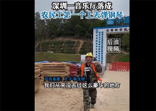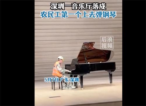 5月7日,廣東省內一家文化館音樂廳正式建成,作為該文化館的建設者,57歲的農民工易群林作為受邀人員登上臺彈奏鋼琴,據他的兒子介紹,他們一家是湖南岳陽人,這個文化館是父親和工友花了三年時間打造的,今天是作為受邀嘉賓前往音樂館參觀,自己的父親在小時候就曾經和家里有人學過彈鋼琴,此次作為音樂廳的建設者受邀前來,父親覺得十分的自豪。