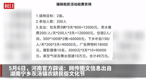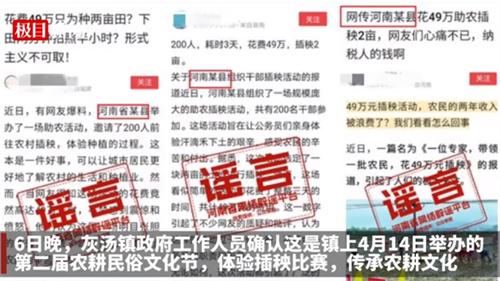 5月4日,網上流傳河南某縣助農活動花費了49萬,該消息稱,這項活動由縣里組織200名干部,耗費了三天時間,由一名專家帶領眾多干部下農田助農,花費了49萬僅插秧兩畝,這則消息在網上迅速引起了眾多網友的質疑,這則消息經過河南省網絡辟謠平臺查證,該消息屬于不實謠言,消息中引用的配圖是農耕活動中的圖片,出自于湖南省寧鄉市灰湯鎮的農耕民俗文化節活動,河南省各地并未有網傳的助農活動。