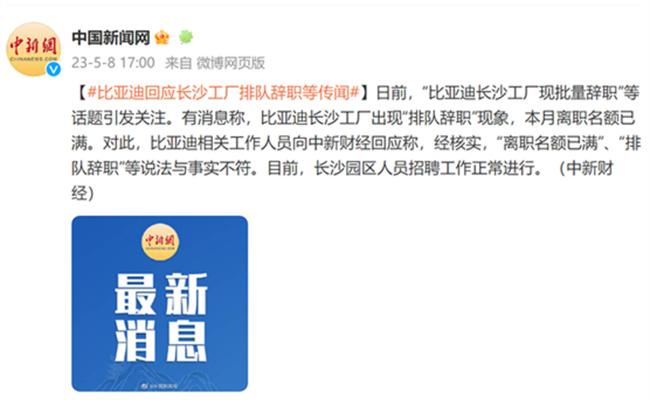 近期有消息傳來,稱長沙比亞迪旗下的望城工廠以及雨花工廠紛紛出現了,工人離職名額已滿,批量辭職等各種消息。比亞迪對這一傳聞最近也作出了正式的回應,比亞迪回應生成經過核實之后,經常出現的離職名額已滿,以及排隊辭職等方法和事實嚴重不符,現在在長沙園區的人員招聘工作也正在有序的進行之中,在回應之中,比亞迪還表示目前公司的訂單銷量都比較良好,而且公司在市場的戰略也極其的穩定,還有所上升,今年的1月份到4月份,公司的銷售量在行業內排在了第一。