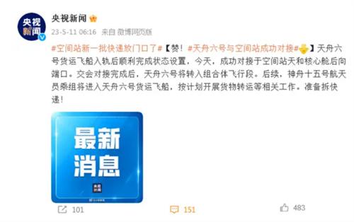 5月11日凌晨5點16分,天舟六號貨運飛船正式對接中國國際空間站,后續(xù)時間神舟15號航天乘組人員將會正式進入天舟六號展開原先計劃的貨物轉運工作,該空間站的對接成功標志著我國航天技術更加成熟了,再次向世界表明,中國航天技術是值得信賴的,中國航天信譽也將在全球成功展露自己的實力。