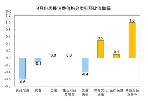 國家統(tǒng)計(jì)局統(tǒng)計(jì)4月份市場的整體供應(yīng)量相對來說比較充足,消費(fèi)的需求正在逐步的恢復(fù)當(dāng)中。扣除能源和食品價(jià)格的核心之后的CPI相對上個(gè)月來說環(huán)比持平,上漲了0.1%,同比上漲的百分比是0.7%,上漲的幅度與上個(gè)月基本上相同。食用油和糧食的價(jià)格基本上保持平穩(wěn)。非食品的價(jià)格由上個(gè)月的持平狀態(tài)轉(zhuǎn)為上漲,比例是0.1個(gè)百分點(diǎn),使得CPI上漲了大約0.4%。非食品行業(yè)中,由于小長假期間,出行方面的需求逐漸增加。交通工具方面的租賃費(fèi)用,飛機(jī)票的費(fèi)用,旅游價(jià)格和住宿的價(jià)格都有所上漲,漲幅基本上維持在4.6%~8%之間。國內(nèi)的柴油和汽油的價(jià)格由于受到了國際原油價(jià)格波動方面的影響有所下降,下降的比例是1.7%。新能源汽車,燃油汽車以及家用電器的價(jià)格,由于各大商家進(jìn)行促銷降價(jià),下降的比例分別是0.9%,1.0%,和0.6%。