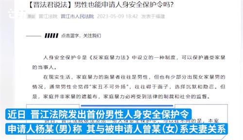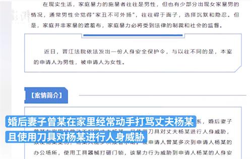 最近,福建晉江市人民法院發布一份人身安全保護令,與尋常時期不同的是,這一份人身安全保護令保護的對象則是男性楊某,楊某所經歷的這一起案件施暴者是他的妻子曾某,據了解,楊某在婚后經常遭受自己妻子的打罵威脅,還多次導致楊某受傷,即便在辦公場所也被妻子打砸過,故此法院依法裁定對楊某發出人身安全保護令。