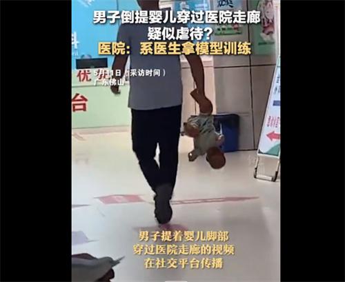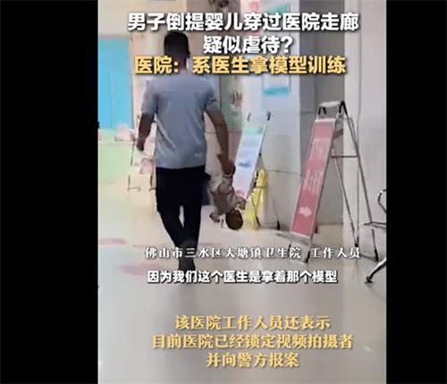 近日,有網友在網上發布一則視頻,該視頻中一名男子在醫院的走廊中單手提著嬰兒的腳行走,他一邊走手中的嬰兒還一邊在哭,這則視頻發出之后引起了很多網友的憤怒,紛紛質疑該男子虐待嬰兒,隨后,該事件發生的佛山市院三水區大鎮衛生院工作人員在網上回應稱,視頻中的男子并非是提著嬰兒,他手中拿著的只是一個嬰兒模型,是準備做一些醫學訓練,視頻中的哭聲是后期配音的,醫院已經對此事報警,警方將會在接下來對發布視頻的人進行調查,追究該事件的責任人。