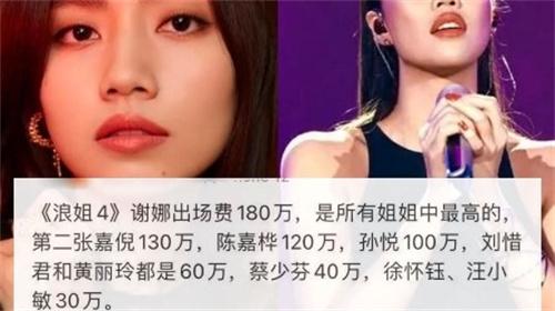 《浪姐4》是一檔非常受人歡迎的女團選秀節目,節目組未要求知名選手上節目,對這些選手都紛紛給予了極其高額的出場費,謝娜的出場費最高為180萬元,張嘉倪的出場費130萬元,陳嘉樺的出場費120萬元,醫院的出場費100萬元,劉惜君以及黃麗玲這兩個人的出場費全部都是60萬元,蔡少芬的出場費為40萬元,而徐懷鈺和汪小敏的出場費則只有30萬元,雖然浪姐4的出場費具體數據并不是特別的全面,但是這一信息被曝光之后就已經快速登上了熱搜頂端。