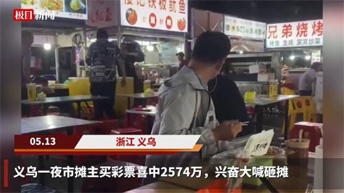 5月14日也有記者向義烏二三里夜市的商戶進行了訪問一,在義烏二三里夜市出攤的商戶告訴記者,視頻中的個這個男人確實買彩票中獎了,而且這個男人是和20多個人一起共同買的彩票,總共花了1000多塊錢,1000多塊錢直接中了2,574萬元,這邊商戶老板在向記者進行回應時還將男子購買彩票的彩票站地理位置告訴了記者。