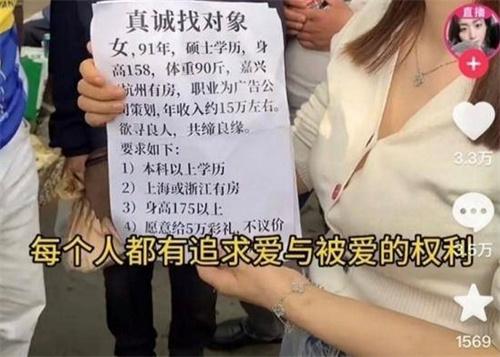 最近浙江杭州一位91年的女生在相親,就要被一名男士懟哭。這名女生在相親角,相親時被男子表示32了還敢開條件,有你這樣條件的人家為什么要選你,就不能清醒一些嗎?這條視頻在網絡上引起了爭議,這名32歲的女生在手寫的紙板當中寫自己學歷是碩士,身高在158左右在杭州,有房子并且年收入10五萬,希望對方是本科及以上學歷,在浙江或者上海有房,身高要求是175以上,彩禮愿意給5萬。