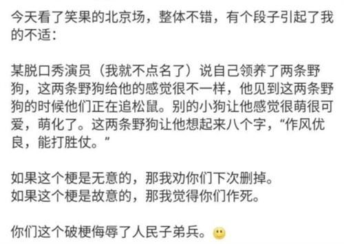 人民日?qǐng)?bào)在微博平臺(tái)上也發(fā)文表示某脫口秀演員在表演時(shí)冒犯,人民子弟兵所屬的公司被立案調(diào)查,并且表示脫口莫脫軌玩梗須有度。片面的去追求笑料不惜踩踏底線陷入誤區(qū)。要行有所止,心有所畏,言有所戒,這也是職業(yè)的底線,并且應(yīng)該成為行業(yè)的共識(shí),樹(shù)立價(jià)值觀,言行不會(huì)跑偏。