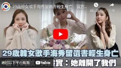 根據(jù)相關(guān)報(bào)道,韓國(guó)一名女歌手在家留下遺書離世,而今年她只有29歲。根據(jù)相關(guān)報(bào)道,韓國(guó)TROT,歌手海秀在5月13日傳出在家中,留下遺書之后去世年僅29歲,官方在15日晚間發(fā)出聲明,表示很抱歉向大家傳達(dá)令人遺憾,感到心痛的消息,海秀在12日永遠(yuǎn)的離開了,我們成為了廣闊大海當(dāng)中的一顆星星。
