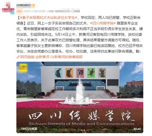記者在北京時間5月14日上午,從網上關注到這一消息之后,也立刻向四川傳媒學院進行了電話詢問,四川傳媒學院的紀委工作人員對記者的詢問給予了回復,稱關于這一消息目前雙方已經報警正式進入到處理環節之中,執行的具體結果還需要警方進行深入調查之后才能夠確切得知,四川傳媒學校的紀委工作人員在和記者溝通,沒過多久之后,孫良超的妻子張女士又再一次在微博上進行了發文,張女士表示自己接到了四川傳媒學校紀委打來的電話,校方針對自己的實名舉報信息目前已經正式舉行了會議,對曾良超的調查將會由黨委辦公室牽頭校紀委,校辦以及法務,共同進行調查。