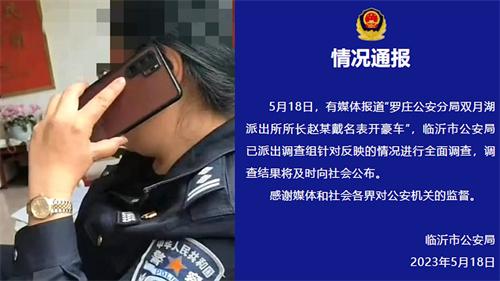 5月18日,有網友在網絡上爆料稱,山東省臨沂市羅莊區雙月湖派出所所長趙某佩戴名表、開豪車的情況,很快這件事就受到多方關注,網絡上的輿論也發酵起來,臨沂市公安局發布情況通報,對于網友反映的這個情況已經進行全面調查,調查結果也將會第一時間向社會公布,感謝社會各界和媒體對公安機關的監督。