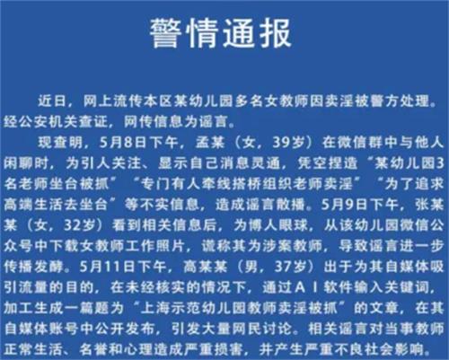 記者也了解到在5月12號的時候上海市公安局青浦分局就已經針對于上海某幼兒園教師賣淫的事件進行了辟謠,還發布了公開回應根據公安機關的詳細調查取證,涉及到上海市某幼兒園教師賣淫的網絡傳言,實際上是謠言編造該起謠言的三名造謠者已經被刑事拘留。