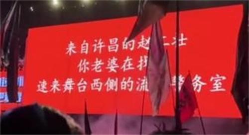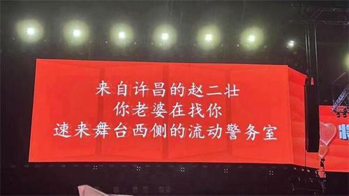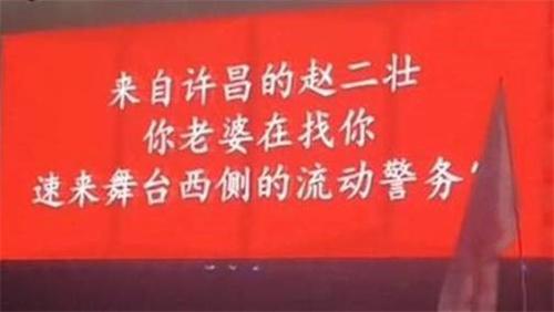 焦作云臺山音樂節(jié)上出現(xiàn)了一個(gè)投屏尋人的故事發(fā)生,在現(xiàn)場,一個(gè)男子和妻子走丟在人超中,視頻顯示,屏幕出現(xiàn)了該男子的尋人啟事,現(xiàn)場觀眾也呼叫這名丈夫的名字尋找他的下落。當(dāng)天晚上韓女士和自己的丈夫在音樂節(jié)上分開,人比較多自己目光所及的范圍之內(nèi)也沒有丈夫的身影,再加上當(dāng)天音樂節(jié)的現(xiàn)場信號不好,三四個(gè)小時(shí)兩人都未能聯(lián)系上,80多通電話也沒有能夠找到丈夫的身影,無奈之下韓女士只能尋找維護(hù)現(xiàn)場治安的警察幫忙。警察在了解事情之后給主辦方聲明情況,讓主辦方在音樂節(jié)的大屏幕上發(fā)布尋人啟事,最后丈夫看到行人請示之后,去固定現(xiàn)場和自己匯合。