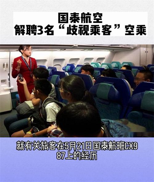 5月21日,有旅客爆料了自己在國泰航班CX987上的經歷,聽到了幾名空姐在歧視聽不懂英語的乘客,在飛行過程中,空乘人員不間斷地使用英語或粵語抱怨乘客,比如“If you cannot speak blanket, you cannot have it”(如果他們不會說毛毯的英文那他們就不配毛毯)……此事很快在網絡上引起輿論,網友紛紛批評國泰航空歧視乘客。