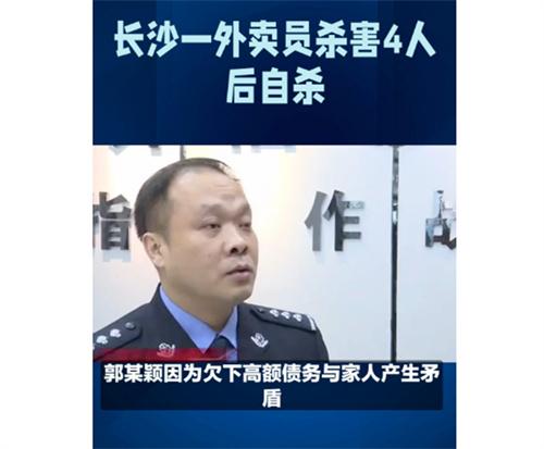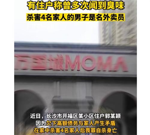 當(dāng)?shù)貢r(shí)間5月26日,湖南省長(zhǎng)沙市開福警方發(fā)布一則警情通報(bào),通報(bào)中表述,在5月24日晚,長(zhǎng)沙市開福區(qū)某小區(qū)住戶郭某,因?yàn)榍废戮揞~債務(wù)與家人發(fā)生矛盾,導(dǎo)致在家中殺害四名家人后畏罪自殺,此次事件中最小的受害者是郭某的女兒,年僅四歲,據(jù)采訪該小區(qū)居民所述,郭某的工作是從事外賣行業(yè),案發(fā)房子是在萬國(guó)城小區(qū)三期某棟六樓四號(hào)房。