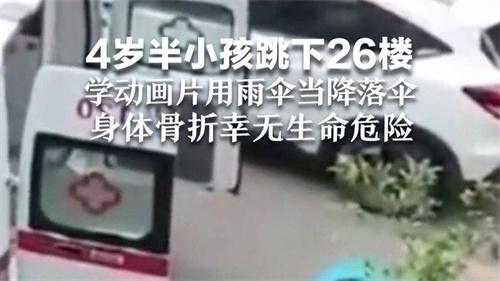 5月27日,有媒體報道昨日一名4歲幼童學(xué)動畫片內(nèi)的情節(jié),撐傘從26樓跳下,導(dǎo)致身體上出現(xiàn)多處骨折,在事發(fā)時女孩的家里并沒有人,父母都在外地工作,奶奶去接姐姐放學(xué),幸虧孩子體重輕,從26樓墜落時有傘降速,被樓下的樹擋了一下,送去醫(yī)院時身體多處骨折,否則將會有生命危險,此事很快就引起廣泛關(guān)注。