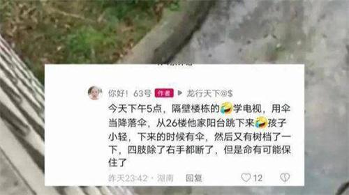 5月27日,有媒體報道昨日一名4歲幼童學動畫片內(nèi)的情節(jié),撐傘從26樓跳下,導致身體上出現(xiàn)多處骨折,在事發(fā)時女孩的家里并沒有人,父母都在外地工作,奶奶去接姐姐放學,幸虧孩子體重輕,從26樓墜落時有傘降速,被樓下的樹擋了一下,送去醫(yī)院時身體多處骨折,否則將會有生命危險,此事很快就引起廣泛關(guān)注。