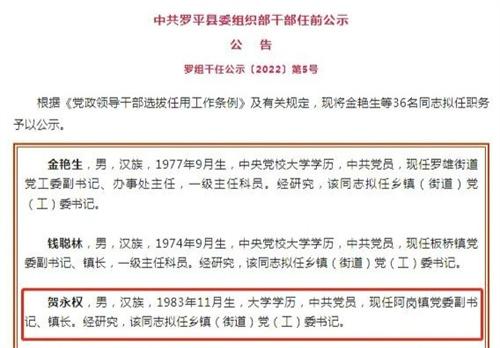羅平縣委組織部相關(guān)部門在5月29日對記者表示,目前正在調(diào)查相關(guān)情況,在時(shí)間有一定進(jìn)展后會(huì)進(jìn)行公告。記者在查詢羅平縣組織部任職的公示信息當(dāng)中,發(fā)現(xiàn)了賀永權(quán)在被查獲酒駕三個(gè)月之后,獲得羅平縣組織部的任職公示,升職成為鎮(zhèn)黨書記。賀永權(quán)出生于1983年,在酒價(jià)之后的三個(gè)月,就從阿崗鎮(zhèn)黨委副書記鎮(zhèn)長提名成為了鄉(xiāng)鎮(zhèn)黨委書記。記者咨詢到了羅平縣阿崗鎮(zhèn)政府的工作人員,也確切的證實(shí)了賀永權(quán)目前是該鎮(zhèn)的黨委書記。