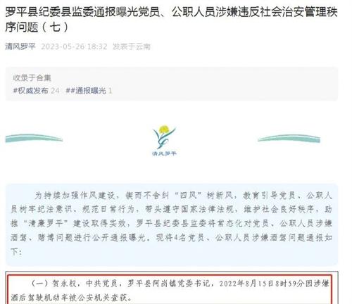 不久前云南省曲靖市羅平縣紀(jì)委監(jiān)委發(fā)布,黨員公職人員涉嫌酒駕,引起了廣泛關(guān)注。公職人員酒駕,是當(dāng)?shù)氐逆?zhèn)長在被查三個(gè)月之后得到了提拔。對于這一件事也引起了眾多網(wǎng)友的熱議,針對此事當(dāng)?shù)刈鞒龌貞?yīng),表示正在處理相關(guān)情況,后續(xù)會(huì)發(fā)布公告。有些人質(zhì)疑忍羅平縣阿崗鎮(zhèn)的鎮(zhèn)長賀永泉在2022年8月15日,因?yàn)樯嫦泳岂{被公安機(jī)關(guān)查獲之后,2022年11月30日參與任職,公示升了鎮(zhèn)黨委書記,很多人質(zhì)疑酒駕官員升職破壞紀(jì)委監(jiān)委執(zhí)紀(jì)監(jiān)督權(quán)威性。
