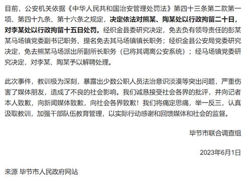 事件中的熊某為織金縣公安局馬場派出所副所長,李某和陶某為馬場派出所警務輔助人員,事件發生后,織金縣委決定的,免具有領導責任的彭某、馬廠鎮黨委副書記職務、織金縣公安局黨委決定免去熊某馬場派出所副所長職務,經過馬廠鎮黨委研究,對這起事件中的陶某和李某解聘。