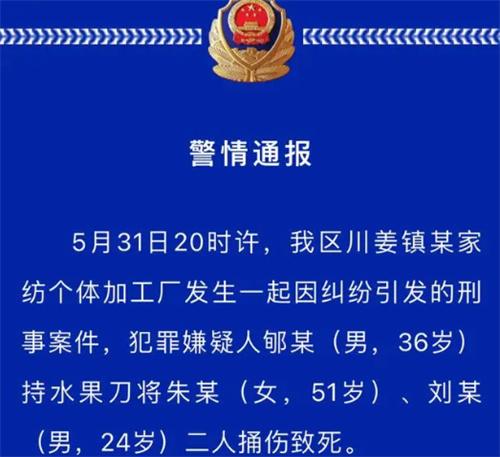 6月2日,來自南通市通州區的公安局發布了最新的通報,在5月31日2:00,許通州區川姜鎮某家紡個體加工廠,發生了因糾紛引發的刑事案件,而當時的犯罪嫌疑人叫做郇某,拿著水果刀將朱某劉某二人捅死。
