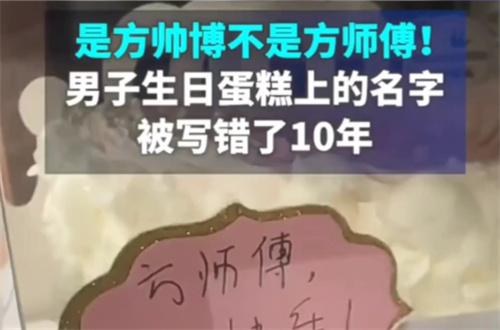 北京時(shí)間6月5號(hào)山東電視臺(tái)閃電新聞視頻報(bào)道,6月4號(hào)在黑龍江齊齊哈爾有一個(gè)男子過生日,但是這名男子的生日蛋糕上的名字已經(jīng)被連續(xù)寫錯(cuò)了長達(dá)10年之久,只見視頻上面的蛋糕上寫著方師傅生日快樂,對(duì)于生日蛋糕上的字,該男子已經(jīng)無力吐槽,表示你們?cè)趯懽值臅r(shí)候能不能看清楚我留的名字呀?我是叫方帥博,我不叫方師傅。截止到目前為止這名男子的視頻點(diǎn)贊量已經(jīng)超過了4.4萬,方帥博出生于2004年,他表示我出生19年來,我的名字被寫錯(cuò)的時(shí)間就長達(dá)了10年。