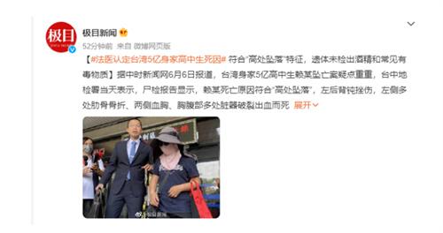 根據臺中地檢署在6月6日發布的尸檢報告稱,賴某的死因符合高空墜落致死,從尸檢報告中顯示,賴某左后背鈍挫傷,左側出現多處肋骨骨折,兩側呈現血胸狀態,體內未檢測出任何酒精和有毒物質,針對這次尸檢報告。死者母親的律師表示,鑒定報告死因和媒體報道以及外界的想象有截然不同的趨勢,報告中沒有寫到有無外力介入,究竟是生前墜樓還是死后墜樓,這一點家屬將會再去請教專業人士。