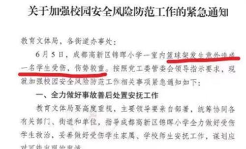 6月6日網(wǎng)傳成都高新區(qū)錦暉小學一位小學生被室內(nèi)籃球架砸傷,傷勢比較嚴重,這件事情引起了人們的關注。在當天下午成都市有多個部門對記者的采訪表示了回應,稱此事正在調查當中。