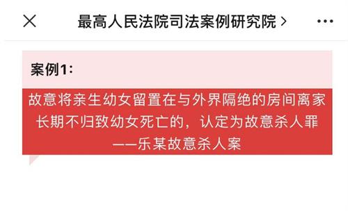 最高人民法院司法案例研究院在6月7日公布的一則案例,這起案例中被告人是南京的一位女子。這名女子故意將親生女兒留置在空無一人的房間中,明知孩子在家無人問津,這名女子仍舊離家長期不歸,導(dǎo)致兩名幼小的孩子在家中餓死,經(jīng)法院審理判決,該女子被認(rèn)定為故意殺人罪。
