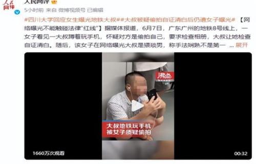人民網評女生曝光地鐵大叔行為,同時也表示網絡曝光不能觸碰法律“紅線”。就在6月7日廣東發生了一女子查看大叔相冊,懷疑大叔偷拍自己,之后將大叔的信息上傳網絡的信息。這起事件的發生在廣東廣州地鐵8號線一名女子看到了,大叔蹲著玩手機,就懷疑對方是在偷拍自己,要求檢查大叔手機的相冊。