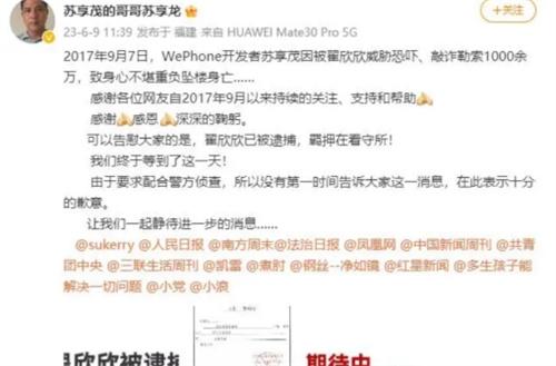 根據此前新聞報道,六年前閃婚的蘇享茂,因為妻子翟欣欣索要千萬財產,導致蘇享茂被逼無奈之下在互聯網上留下公開遺書選擇跳樓自殺,2023年的6月9日,蘇享茂的哥哥蘇享龍在社交媒體平臺上寫道。弟弟在2017年9月7日,因為被翟欣欣威脅恐嚇,勒索1000多萬元,導致身心不堪之下選擇跳樓自殺。感謝眾多網友從2017年以來對這件事情的關注與幫助,目前翟欣欣已經被正式逮捕,我們家屬終于等到了這一天。
