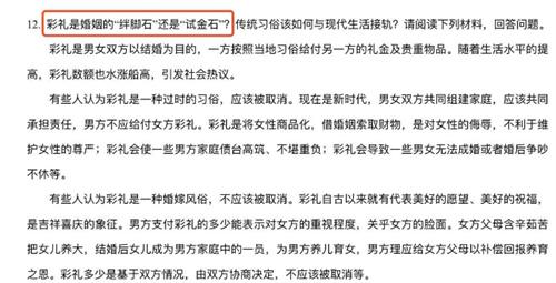 在中考卷子上出現(xiàn)彩禮的考題確實有點為時尚早,他們只有十四五歲他們的思考問題方式和成年人的思考問題方式有很大的區(qū)別。彩禮問題在我國古代就一直盛行,這種風(fēng)俗也延續(xù)到了現(xiàn)代,究竟彩禮是二人結(jié)婚的試金石還是絆腳石還是因人而異,彩禮也是男女雙方以結(jié)婚為目的。按照當(dāng)?shù)氐牧?xí)俗去付給另外一方的禮金,隨著現(xiàn)代生活水平越來越高,在某些地區(qū)的風(fēng)俗上彩禮的金額也越來越高。一般女生的家長在接到男方給的彩禮之后,并沒有將這筆錢私自花掉,而是將這筆錢作為小兩口的婚姻基金又返還給了小兩口,反而女方的家長也會根據(jù)自家的條件給女方一定金額的陪嫁,希望二人在結(jié)婚之后能夠?qū)⒒橐錾罱?jīng)營的美好。