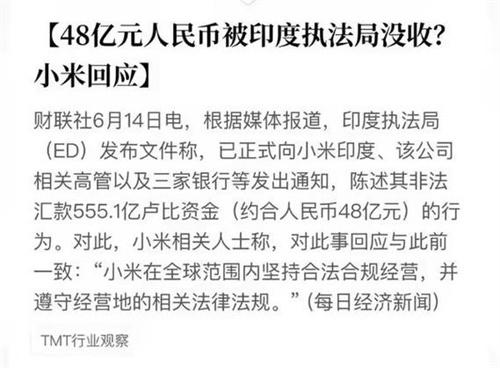 6月13日有消息傳來稱,印度執法局已經對小米下發了正式文件,文件的主要內容則是像小米在印度經營公司的相關高管以及三家銀行正式發出通知,對于小米非法匯款的48億元人民幣將會進行沒收。對于印度執法局所下發的這一份文件通知,小米的相關工作人員也對媒體正式給出了回應,稱對于這起案件的態度,小米將會和之前保持的態度一致,此前小米曾對法院申訴過,要求駁回這一信息,小米一方也曾公開進行回應過。目前對于該起事件也正在進行研究,等待書面判決文件的下發,在此小米還將重癥重生,小米在夜度的所有任務全部都與印度的相關法律法規完全符合。