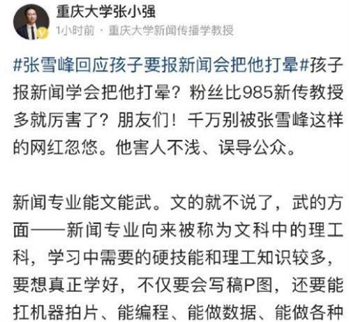 近段時(shí)間,網(wǎng)紅張雪峰遇到了麻煩,因?yàn)榻ㄗh咨詢的考生家長,理科590分的孩子非要報(bào)新聞學(xué),我一定會(huì)把他打暈。遭受到新聞專業(yè)教授的圍攻,首先是重慶大學(xué)的張小強(qiáng)教授對(duì)他一頓炮轟,先是鄙視,然后說千萬別被張雪峰這樣的網(wǎng)紅給忽悠了,害人不淺,而且是誤導(dǎo)公眾,并且表示新聞專業(yè)能文能武。就業(yè)前景十分的廣闊,面對(duì)張雪峰談到的粉絲問題,更是說他是無稽之談,讓張雪峰來和她比較科研,面對(duì)這位教授的如此硬剛,網(wǎng)友們卻是不買賬,并且還嘲笑這位教授張小強(qiáng)用力太猛,卻并沒有發(fā)現(xiàn)問題的本質(zhì)。