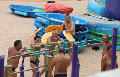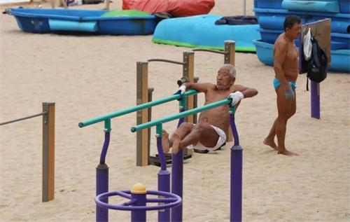 從現(xiàn)場流露出來的照片可以看得出,一群大爺們有玩雙杠的,打排球的,擼鐵的,一大把年紀都照樣有八塊腹肌的,就像是一排黑色巧克力,而且還有媒體記者采訪過這幾位大爺,最印象深刻的是有三位90后,這個90后他的意思是年齡在90歲以上。他們其中一位還是退休體育教師,每天上午都來打排球,另一位是堅持冬泳將近60年,還有一位每天都在練習倒立,看到他們?nèi)绱藷釔圻\動,當然,青島還有一群穿著臉基尼的大媽。
