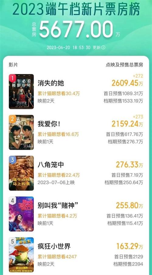 2023年端午檔進(jìn)入到了倒計(jì)時,其中有多部精彩的電影都是獲得了比較好的票房,而且屬于是贏在了起跑線。目前兩部電影消失的她,我愛你都是在電影院當(dāng)中獲得了比較好的反響,同時票房均是超過兩千萬,也是成為了檔期票冠軍種子選手,和其他的電影全部相加起來。2023的端午節(jié)暑期檔總票房破了20億元,雖然數(shù)據(jù)上面并沒有這么的亮眼,但是對于整個電影行業(yè)來說也是一個不可多得的好成績,畢竟疫情剛剛開放,沒有多久就能夠獲得這么高的票房,有許多人還沒有能夠從疫情當(dāng)中走出來,所以也沒有進(jìn)到電影院去看電影。相信在接下來的幾天,電影院的票房還會有一波增長的趨勢。