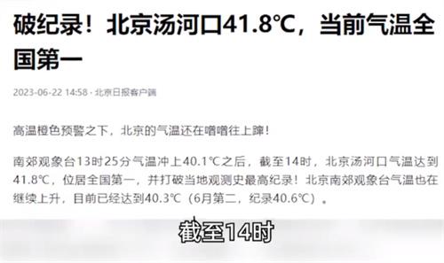 6月22日,中國天氣報道當天下午,北京南郊觀象臺氣溫達到40.7攝氏度,已經打破了六月份最高氣溫的記錄。截止到當天下午14時,北京湯河口氣溫達到41.8攝氏度,已經位居全國第一位水平,更是打破了當地觀測歷史的最高紀錄,預計在端午節假后的兩天,北京地區仍舊會持續高溫烹煮天氣。