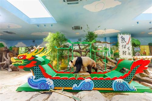 廣州長隆野生動物園的保育員,一大早起來就開始為大熊貓帥帥準備端午節的禮物。首先是一艘龍船,這艘輪船有5.5米長,整個船身上都有著波浪的圖文,龍船頭和尾的圖案也非常的逼真,活靈活現,保育員們將這艘大輪船放到了大熊貓帥帥平時活動的地方。龍船四周掛滿了大熊貓飼養員為帥帥所準備的特制的粽子。龍船上還專門放置了使用竹子所做的船槳,大熊貓既可以玩耍也可以食用。可以算得上是儀式感滿滿。