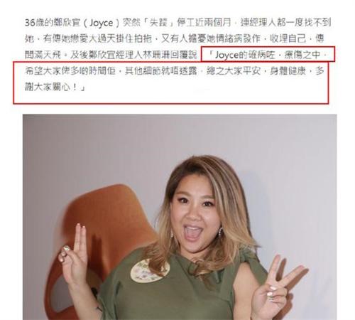 鄭欣宜是香港知名歌手,也是鄭少秋和沈殿霞的女兒,近日傳出他已經失蹤兩個月。傳言鄭欣宜由于抑郁癥發作,身體健康,情況堪憂,甚至連他的經紀人公司都沒有辦法聯絡上她。也有人傳言鄭欣妍已經去世。鄭欣宜的幾位好友和工作上的伙伴在此前均對此進行了辟謠,表示他只是由于生病了正在休息。鄭欣宜的經紀人林珊珊6月25日通過社交平臺對鄭欣怡失蹤的消息進行了回應表示Joyce的確是生病了,目前還正在療傷當中,其他的細節不方便進行透露,總之目前是平安的,身體也是健康的,對于大家的關心表示感謝。