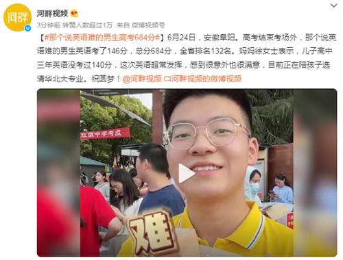 那個在高考結束后考場外說英語難的考生6月24日查詢了自己的成績,英語竟然考了146,總分是684分,在安徽省全省的排名是132名。這名男孩的媽媽說高中三年兒子的英語從來沒考過140分,這次英語是超常發揮,感到非常的意外,也非常的高興。