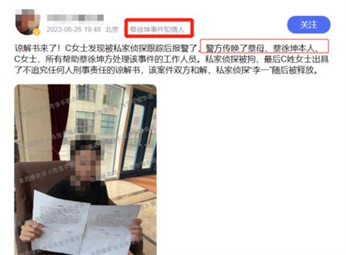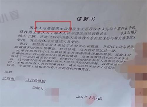 第2個重點則是這名女士最終選擇諒解了蔡徐坤,并且出示讓解書,表示對于蔡徐坤這一方面的刑事責任不會再去進行追究,而且在直播間里面。這名女士的諒解書照片也被曝光了出來,直播間進行爆料時表示,由于蔡徐坤屬于公眾人物因子,在出示諒解書時,蔡徐坤這一方面就要求不要寫上蔡徐坤本人的名字,最終選擇使用蔡姓男士代替了蔡徐坤的名字。