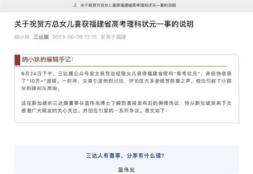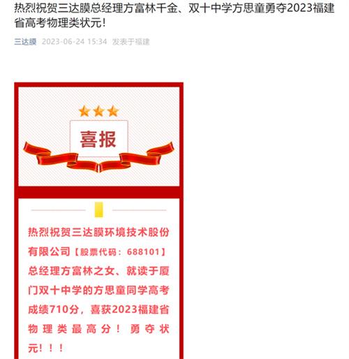 根據(jù)三達(dá)集團(tuán)的董事長(zhǎng)藍(lán)偉光的表示,藍(lán)偉光稱自己在新加坡總部參加活動(dòng)的時(shí)候,無(wú)意間看到了公司內(nèi)部聊天群非常頻繁的聊天,聊天群里還頻繁的出現(xiàn)太優(yōu)秀了,讓老板請(qǐng)客慶祝散打有如此優(yōu)秀的第2代等各種消息。看到這些消息之后,藍(lán)偉光本來(lái)以為自己的女兒拿到了獎(jiǎng)項(xiàng)之后,便給自己的家里打電話進(jìn)行詢問(wèn),經(jīng)過(guò)詢問(wèn)之后得知,并不是自己的女兒獲得了獎(jiǎng)項(xiàng),而是公司總經(jīng)理方富林的女兒在參加高考時(shí),獲得了福建省理科狀元。