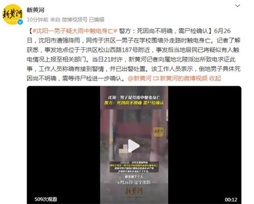 6月26日,網傳沈陽突降暴雨一男子在學校圍墻外走路時觸電身亡。據了解,這起事件發生的地點是在沈陽市紅區松山西路187號附近。事發后,有當地居民疑似將有人觸電情況上報給相關機構,當日晚些時候,媒體向當地派出所致電求證此事。派出所工作人員表示,已經接到該事件相關警情,并已經出警處置,倒地男子具體的死因仍舊不明,需要等待尸檢做進一步的確定。